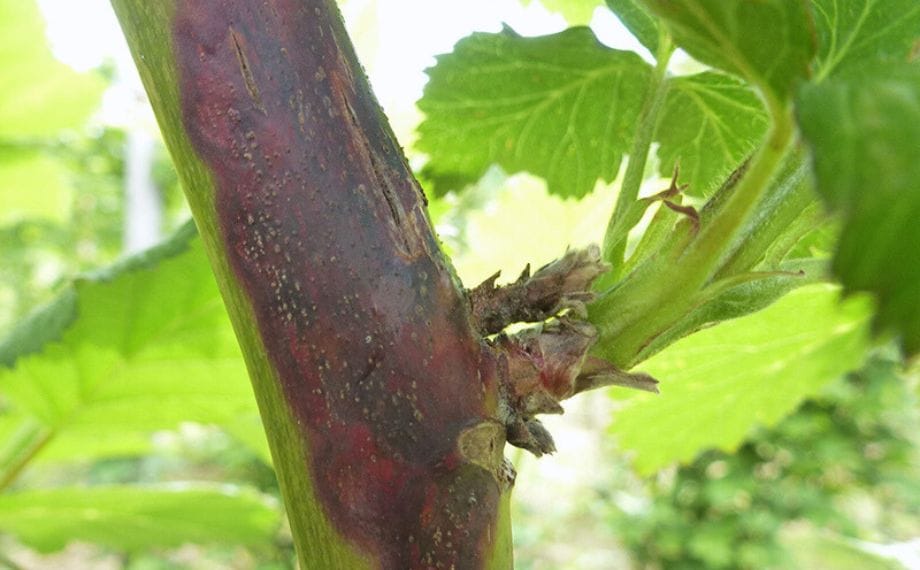 HIGHLIGHT Onemocnění je často spojeno s výskytem škůdce bejlomorka maliníkorová (Resseliella theobaldi), jehož napadení se od poloviny léta projevuje tvorbou hálek na prutech. Houba totiž do maliníku proniká právě v místech poškozených sáním larev bejlomorky.