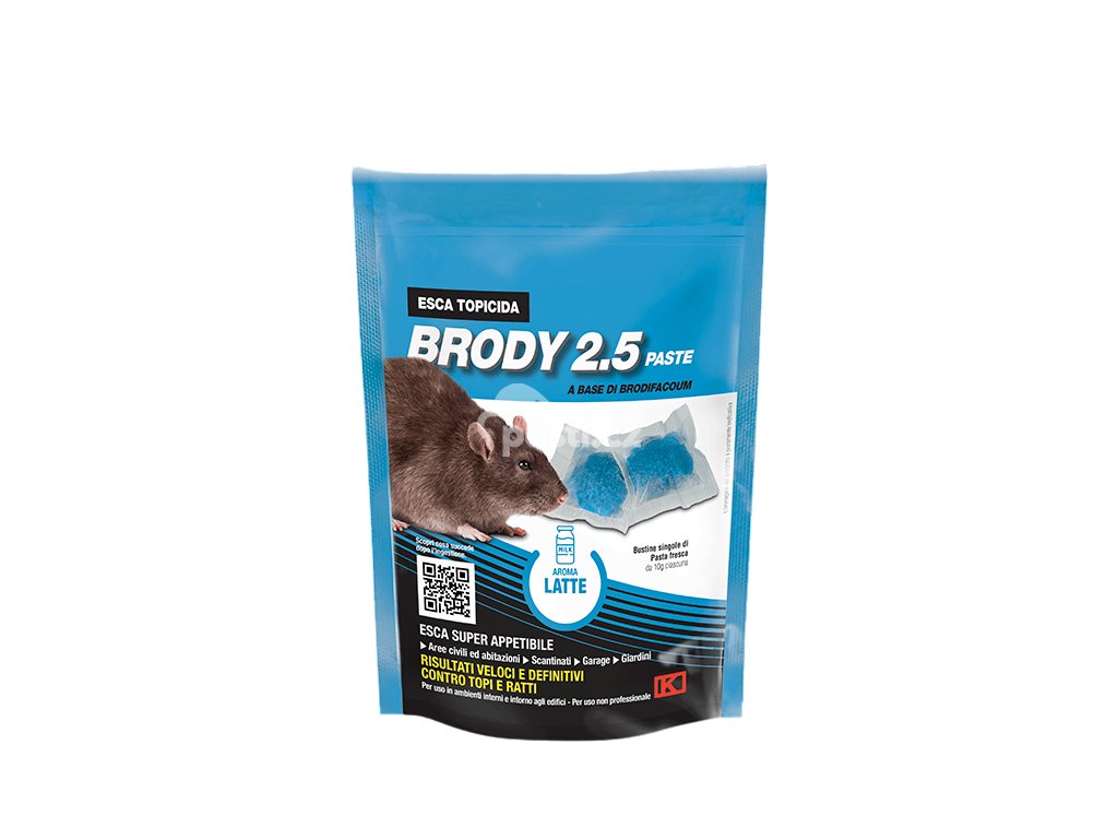 Kollant Brody 2.5 Pasta (s příchutí mléka) je hotová rodenticidní nástraha určená pro profesionální i běžné použití. Obsahuje účinnou látku brodifacoum, která se řadí mezi nejsilnější antikoagulanty.