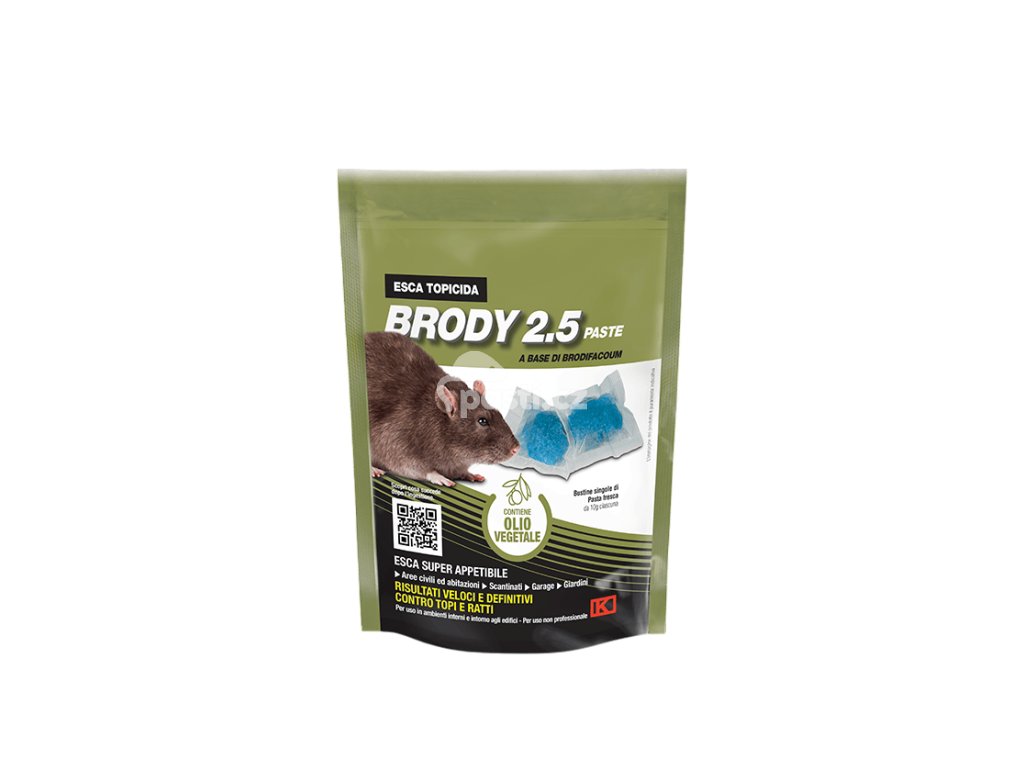 Kollant Brody 2.5 Pasta s rostlinným olejem je hotová rodenticidní nástraha určená k profesionálnímu i běžnému použití. Obsahuje účinnou látku brodifacoum, která se řadí mezi nejsilnější antikoagulanty. Hlodavci hynou i po jednorázovém příjmu nástrahy.
