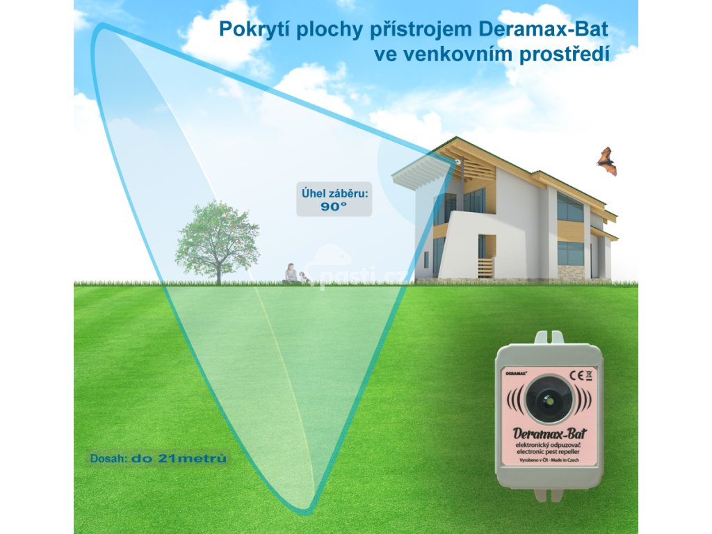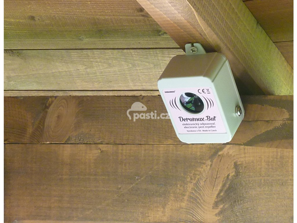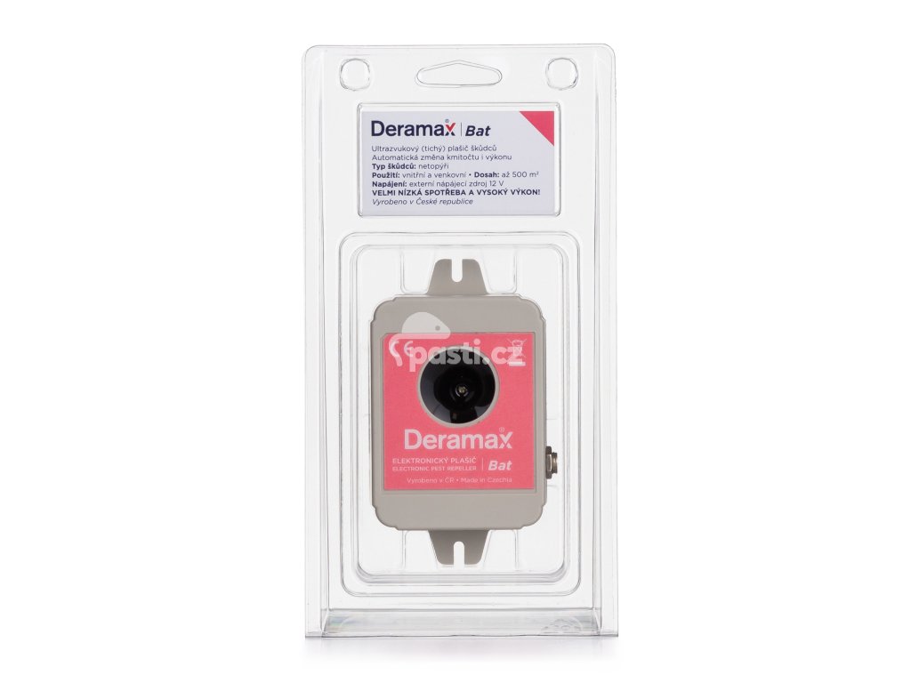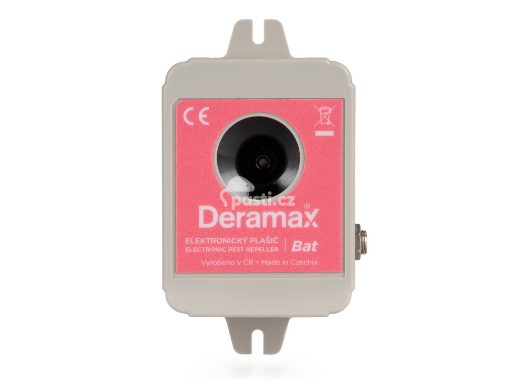 Kvalitní ultrazvukový odpuzovač netopýrů vyráběný v České republice. Je napájený ze zásuvky a díky tomu má vyšší výkon oproti plašiči Deramax Echo, který je napájen z baterie. Deramax Bat je určený k ochraně vnitřních nebo venkovních prostor.