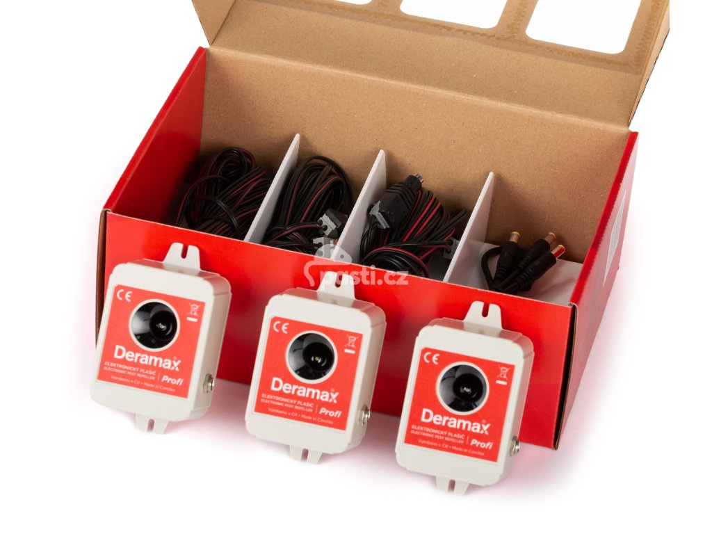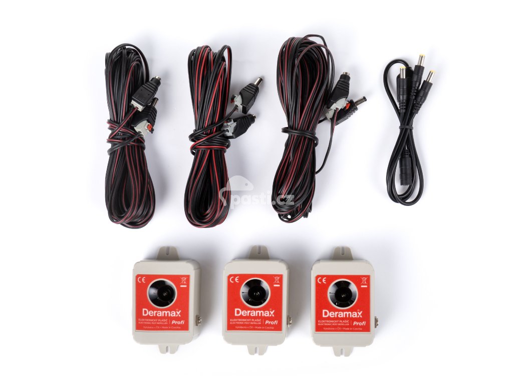 Sada Deramax-Profi-Trio se skládá z 3 ks odpuzovačů Deramax Profi, které se připojují k centrálnímu napájecímu rozbočovači pomocí napájecích kablíků o délce 10m. Rozbočovač slučuje všechny napájecí kablíky a připojuje je k centrálnímu napájecími zdroji (síťový napájecí zdroj se kupuje zvlášť).