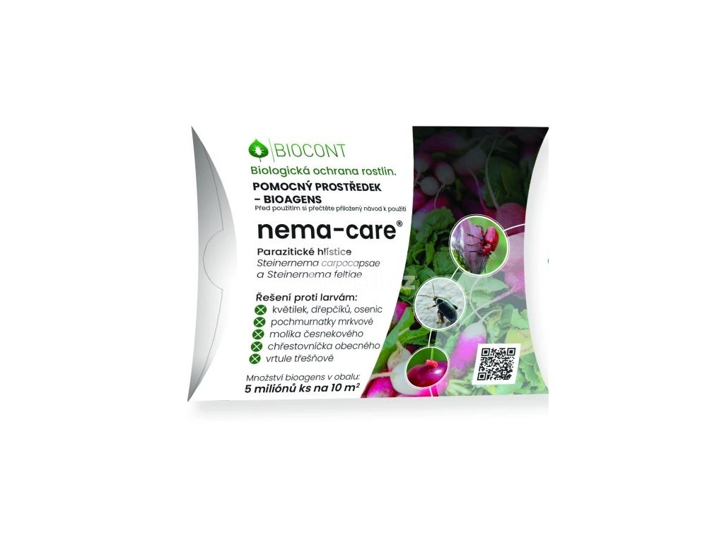 Přípravek Nema-care představuje biologickou ochranu trávníků, stromů i zeleniny ve vaší zahradě. Obsahuje živé hlístice rodu Steinernema carpopsae a Steinernema feltiae. Tyto hlístice aktivně vyhledávají živé larvy škůdců v půdě.