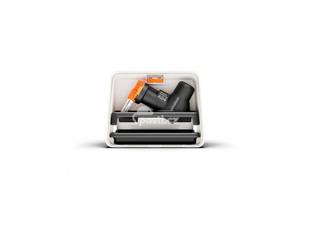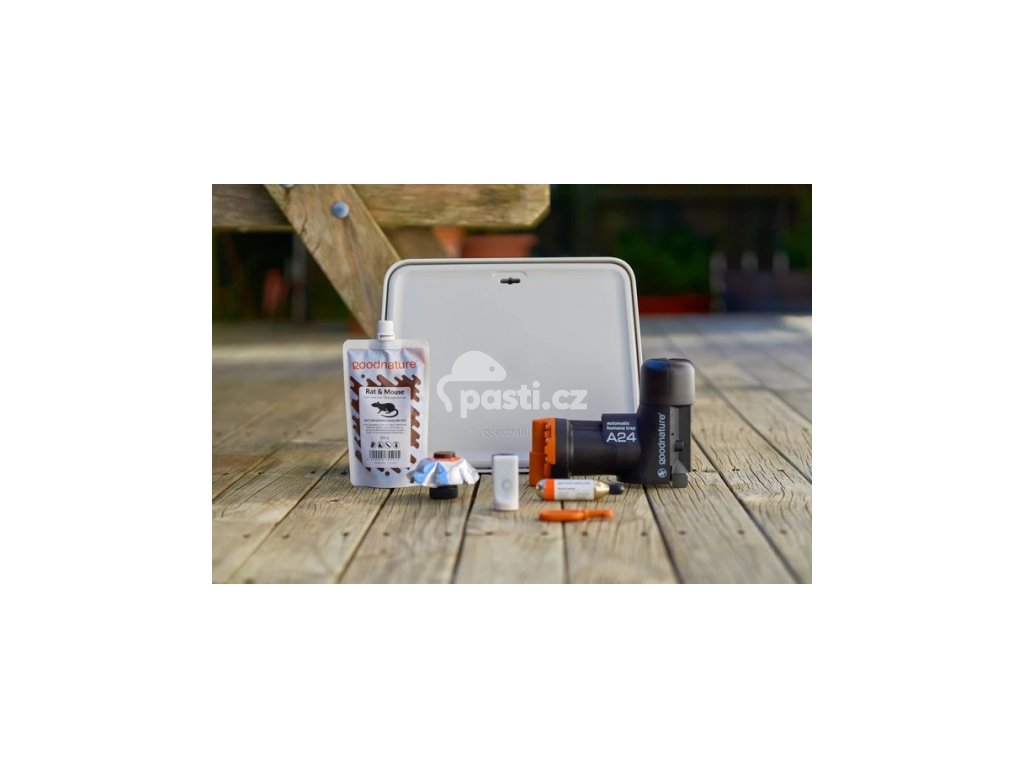 Profesionální balíček Goodnature A24 je ideální pro techniky, kteří potřebují past ovládat z větší vzdálenosti. Past se sama resetuje, automatický dávkovač sám doplní návnadu, proto je past na usmrcení hlodavce připravena 7 dní v týdnu, 24 hodin denně aniž byste museli zakročit. Počet usmrcení, potřebu výměny plynové bombičky nebo nového automatického dávkovače můžete sledovat díky aplikaci přes chytrý telefon. Při použití Trap Boxu je vše diskrétně schováno a dokud nebude potřeba zlikvidovat mrtvého hlodavce, můžete vše vypustit z hlavy.